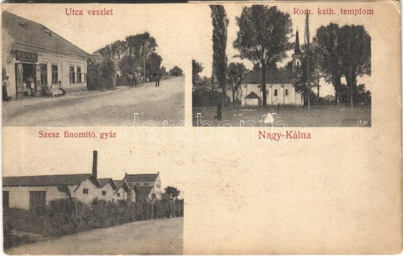 Nagykálna, Kalná, Kálna (Léva, Levice); utca részlet, Szesz finomító gyár, Római katolikus templom, Róbb Vilmos üzlete és saját kiadása / street, church, shop, distillery