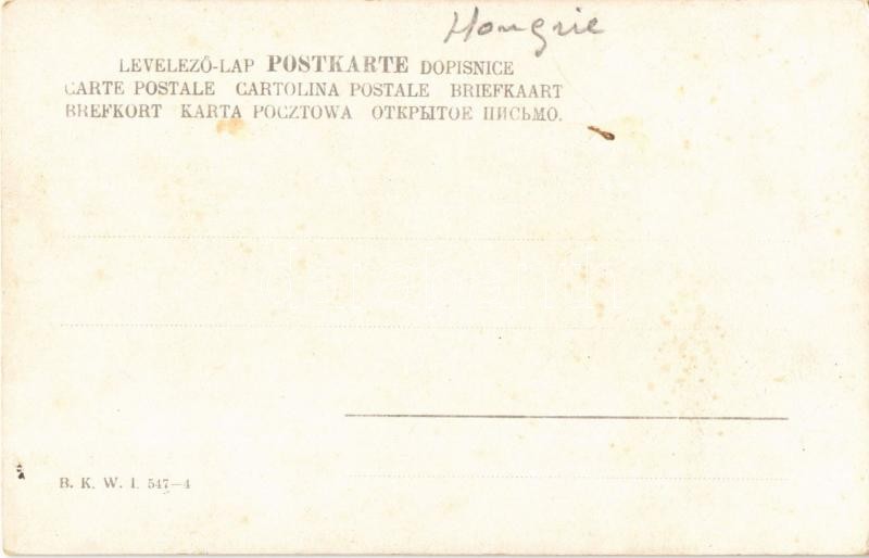 Leírás: Ungarn / La Hongrie / Magyar népviselet és címer / Hungarian folklore and coat of arms. B.K.W.I. 547-4. s: Karpellus (fl)