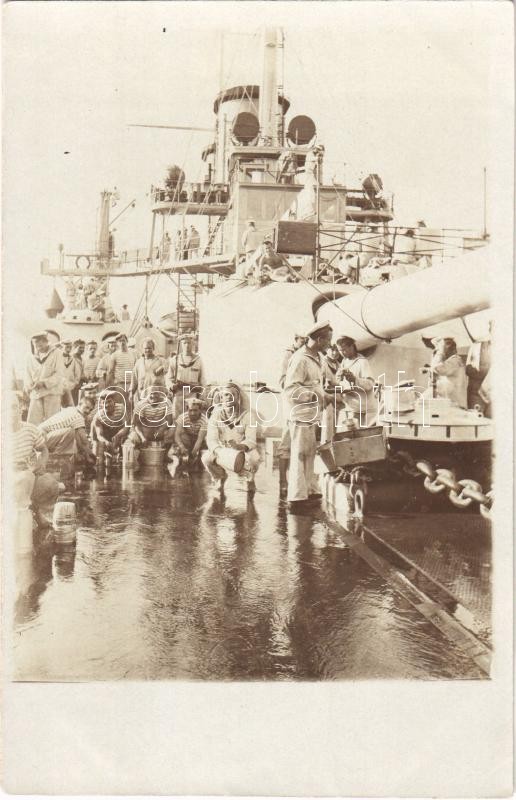 Leírás: 1915 Pola, Pula; SMS Zrínyi az Osztrák-Magyar Haditengerészet Radetzky-osztályú pre-dreadnought csatahajó fedélzete, edénymosás a Vordere Freidecken / K.u.K. Kriegsmarine Matrosen / Austro-Hungarian Navy, mariners of SMS Zrínyi dishwashing on deck. photo