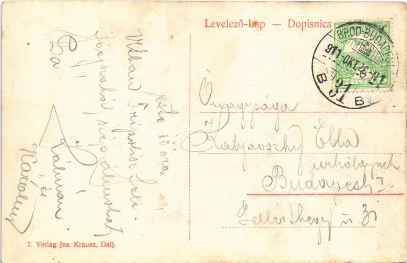 Leírás: 1911 Dálya, Dalja, Dalj (Erdőd, Erdut); Trajekt Gombos / Personenzug / személyvonat gőzkompon Gombos felé. Jos. Krausz 7. / train on steam ferry to Bogojevo (fl)