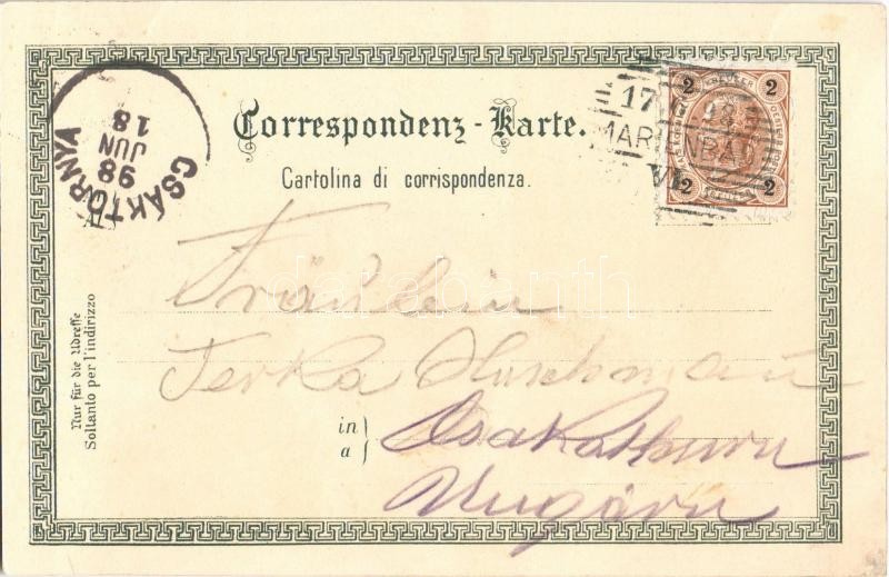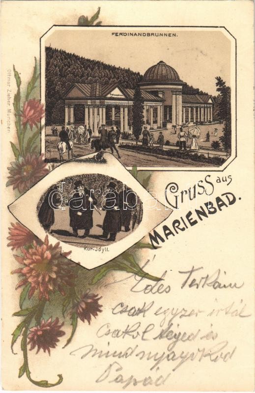 1898 (Vorläufer) Gruss aus Marienbad! Ferdinandbrunnen, Kur-Idyll / Zsidó férfiak a gyógyparkban. Judaika / Greeting from Mariánské Lázne! Jewish men. Judaica, Ottmar Zieher Art Nouveau, floral, litho