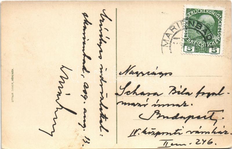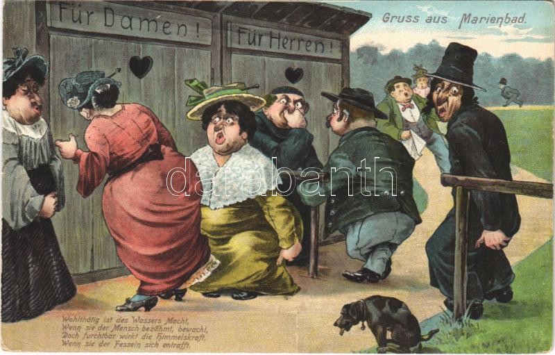 Gruss aus Marienbad / Greeting from Mariánské Lázne, Jewish spa guests having diarrheam all lined up in front of the toilet. Judaica humour / Üdvözlet Marienbad-ból! Zsidó fürdővendégek hasmenéssel küszködnek. Judaika humor. Ottmar Zieher
