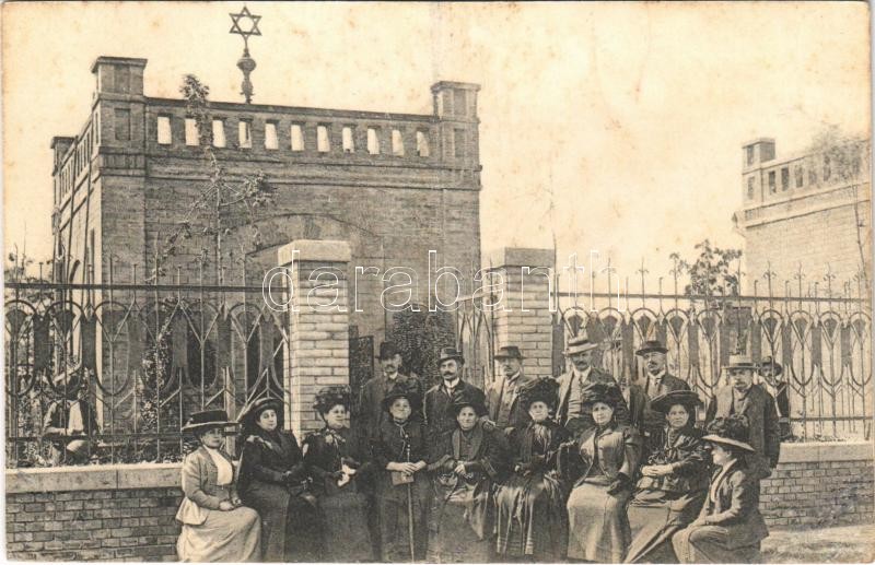 Néhai Schwartz Farkas és Farkasné halálának évfordulója, zsidó kripta a temetőben a gyászoló családdal. Judaika / Jewish crypt in the cemetery with mourning family. Judaica (r)