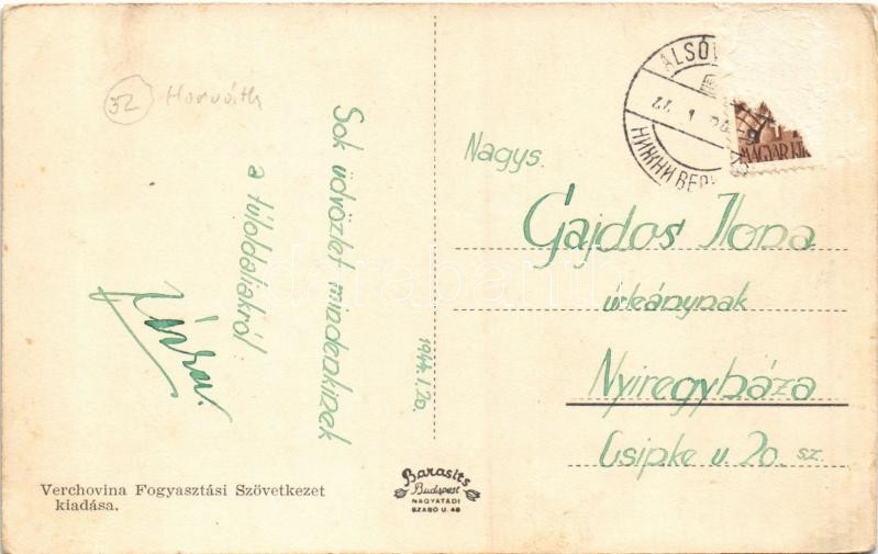 Leírás: 1944 Alsóverecke, Niznije Verecki, Nizsnyi Vorota, Nyzhni Vorota; Magyar-orosz határ zászlókkal. Verchovina Fogyasztási Szövetkezet kiadása / Hungarian-Russian border with flags (Rb)