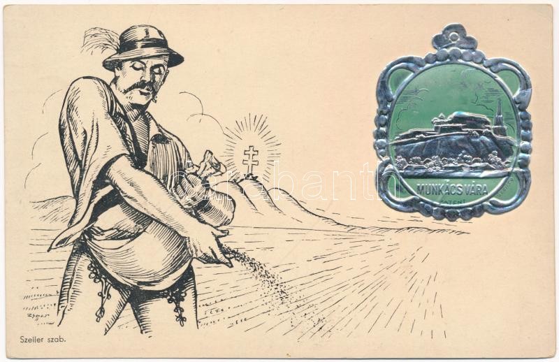 Leírás: Munkács, Mukacheve, Mukachevo, Mukacevo; Irredenta művészlap. Szeiler féle Patent dombornyomott fémplaketten / Hungarian irredenta embossed art (EK)