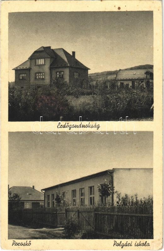 Leírás: Poroskő, Poroskovo, Poroshkovo; erdőgondnokság, polgári iskola / forestry office, school (EK)