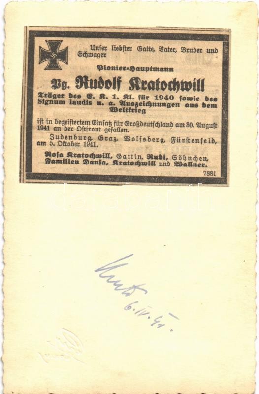 1941 Rudolf Kratochwill második világháborús német SS tiszt portréja hátoldalon gyászjelentéssel / WWII German Nazi SS military officer's portrait with obituary on the backside. photo