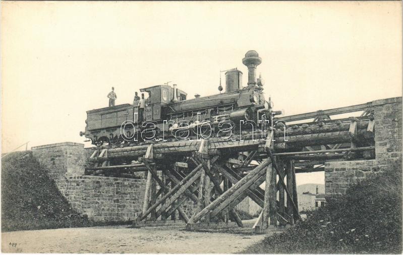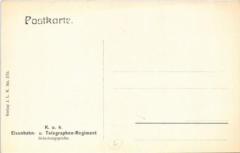 Cs. és kir. vasúti és távirati ezred által épített vasúti híd, terhelési próbája gőzmozdonnyal / K.u.K. Eisenbahn- und Telegraphen Regiment, Belastungsprobe / Austro-Hungarian Railway and Telegraphy Regiment, railway bridge, load test with locomotive