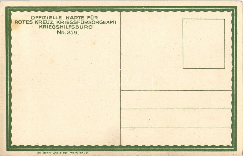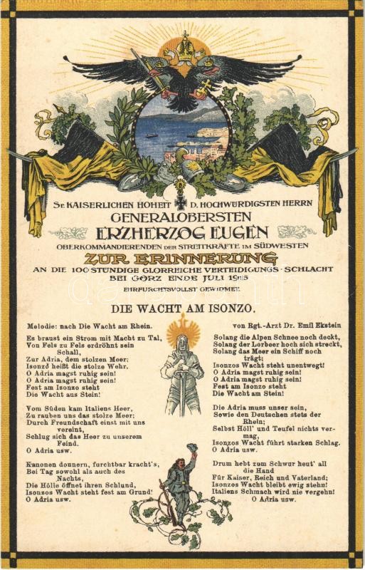 Die Wacht am Isonzo. Sr. Kaiserliche Hoheit d. Hochwürdigsten Herrn Generalobersten Erzherzog Eugen oberkommandierenden der Streitkräfte im Südwesten zur Erinnerung an die 100 Stündige Glorreiche Verteidigungs-Schlacht bei Görz ende Juli 1915. Offizielle Karte für Rotes Kreuz, kriegsfürsorgeamt Kriegshilfsbüro Nr. 259. Art Nouveau, litho