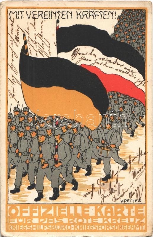 Mit Vereintem Kräften! Offizielle Karte für das Rote Kreuz Kriegshilfsbüro, Kriegsfürsorgeamt / WWI German military propaganda art postcard, litho s: V. Petter (EK)