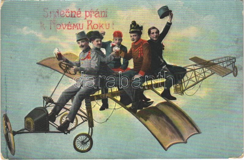 Söröző osztrák-magyar katonák újévi üdvözlete repülőgépből / K.u.K. (Austro-Hungarian) military New Year greeting with aircraft, soldiers drinking beer (EK)