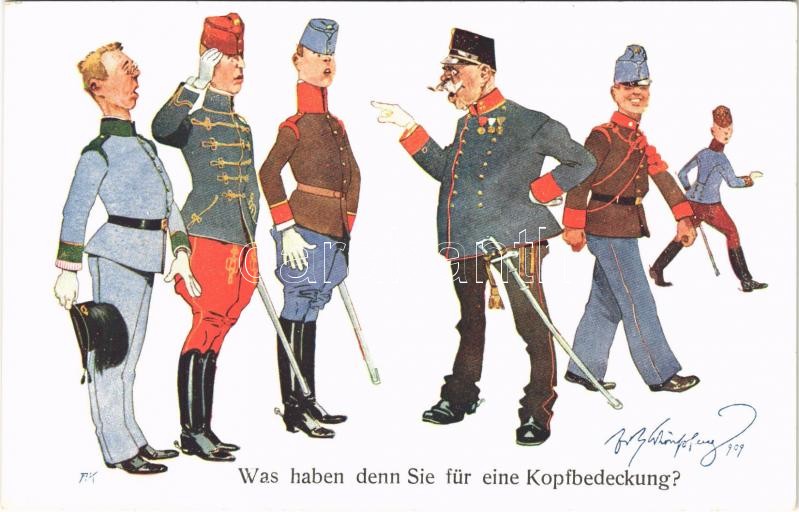 Was haben denn Sie für eine Kopfbedeckung? K.u.K. Militärhumor / Osztrák-magyar katonai humor / Austro-Hungarian military humour. B.K.W.I. 336-1. s: Fritz Schönpflug