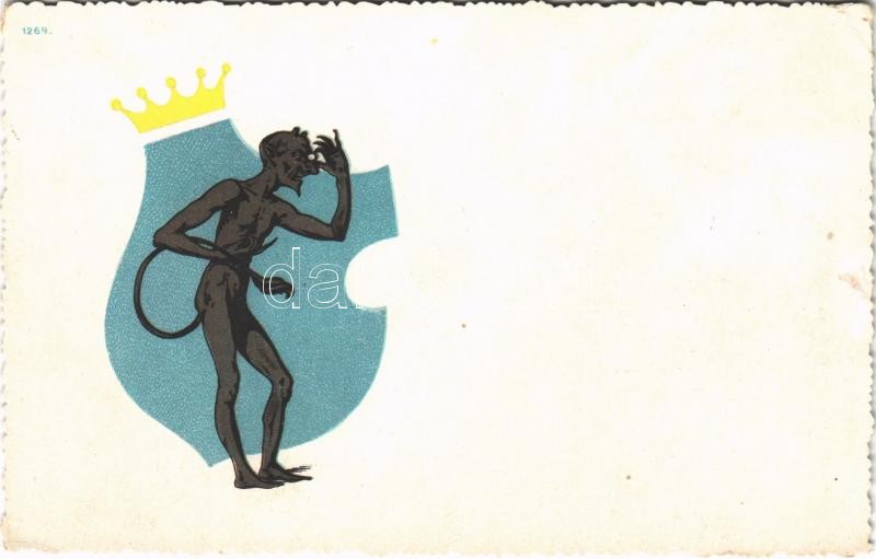 Krampusz koronás címerrel / Krampus with crowned coat of arms. litho https://www.darabanth.com/hu/35-Nagyaukcio/35.1/Kepeslapok/Krampusz~14720/Krampusz-koronas-cimerrel-Krampus-with-crowned-coat-of-arms-litho~II2368274