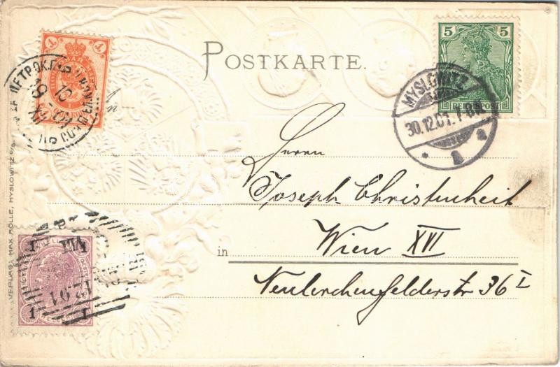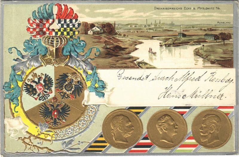 1901 Myslowice, Myslowitz (Ober-Schlesien); Dreikaiserreichs Ecke. Verlag Max Pölle / Three Emperors' Corner, German-Austro-Russian triple border, Franz Joseph, Wilhelm II and Nicholas II of Russia on coins. Coat of arms, Embossed Art Nouveau litho / Német-osztrák-orosz határ. Szecessziós, dombornyomott litho címerekkel és az uralkodók képeivel. Hátoldalon a három ország különböző bélyegével / With 3 different stamps of the three countries