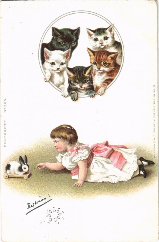 Leírás: 1899 (Vorläufer) Macskák, kislány nyuszis játékkal / Cats, little girl with toy rabbit. Kunstanstalt Wilhelm Boehme Postkarte No. 205. litho