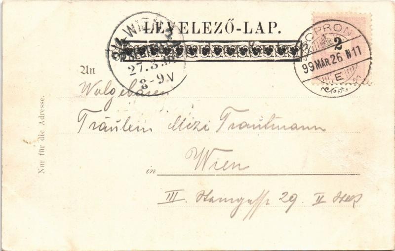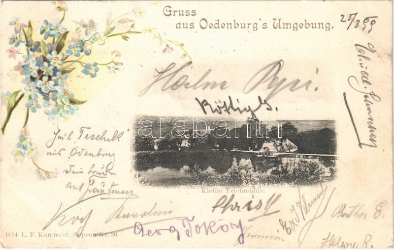 Leírás: 1899 (Vorläufer) Sopron, Oedenburg; Kleine Teichmühle / Tómalom. L.F. Kummert 1694. floral, litho
