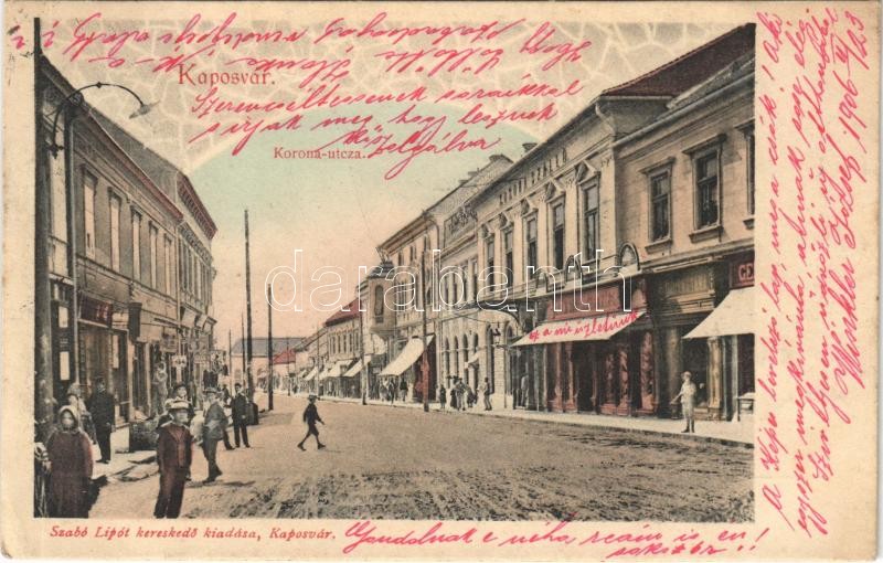 Leírás: 1906 Kaposvár, Korona utca és szálló, Löw Mór és Testvére üzlete