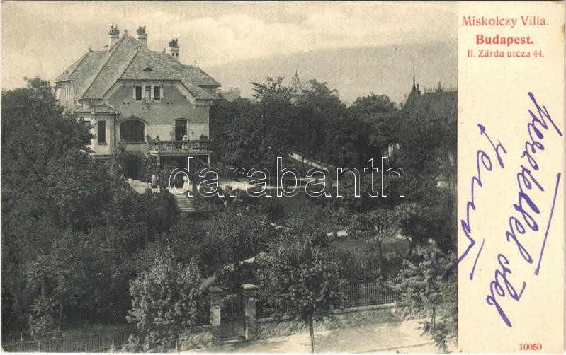 1908 Budapest II. Rózsadomb, Miskolczy Villa. Zárda utca 44 (ma Rómer ... https://www.darabanth.com/hu/35-Nagyaukcio/35.1/Kepeslapok/Magyarorszag~14666/1908-Budapest-II-Rozsadomb-Miskolczy-Villa-Zarda-utca-44-ma-Romer-Floris-utca~II2370581