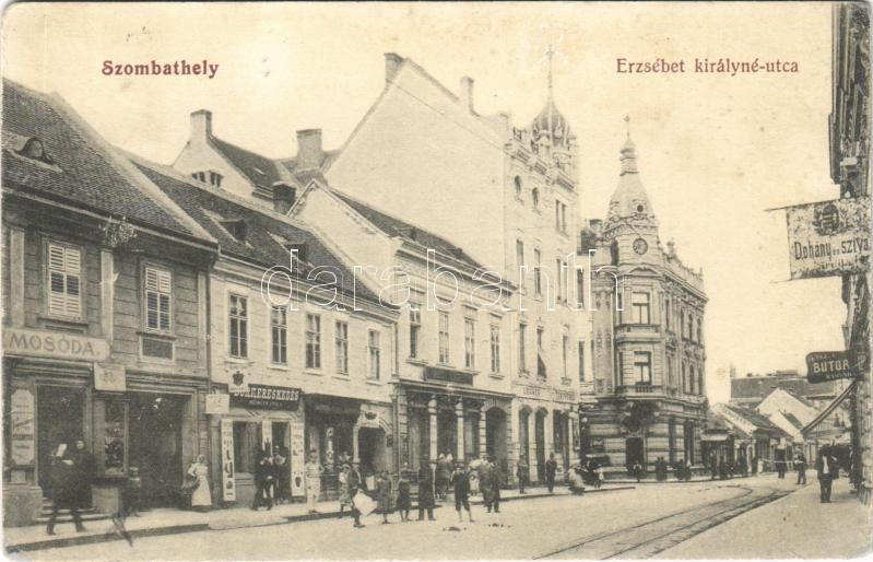1912 Szombathely, Erzsébet királyné utca, dohány és szivar áruda, bútor raktár, Edenhoffer, Legáth testvérek, Heimler Gyula bőrkereskedés és Rosenberg üzlete, mosoda (fl)