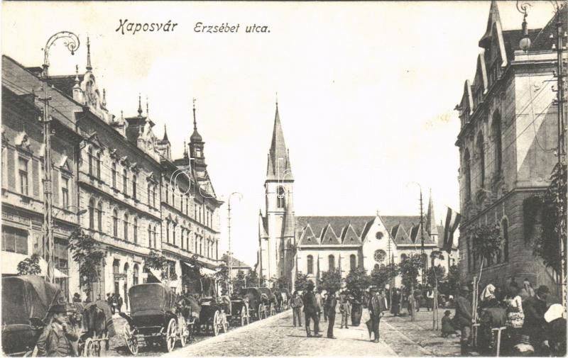1915 Kaposvár, Erzsébet utca, piac, lovaskocsik, templom, magyar zászl... https://www.darabanth.com/hu/35-Nagyaukcio/35.1/Kepeslapok/Magyarorszag~14666/1915-Kaposvar-Erzsebet-utca-piac-lovaskocsik-templom-magyar-zaszlo-Schvarcz-Samu-es-TorC3~II2361426