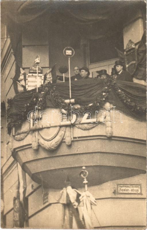 Leírás: 1933 Budapest V. Lipótváros, Gömbös Gyula miniszter megnyitja a Nemzeti Munkahetet a TESZ székház erkélyén a Szalay és Falk Miksa utca sarkán. photo