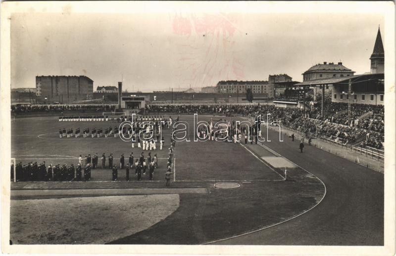Leírás: 1935 Budapest XI. Újbuda, VI. Főiskolai Világbajnokságok a BEAC (Budapesti Egyetemi Atlétikai Club) sportpályán