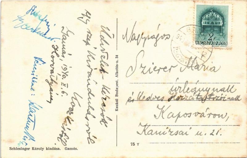 Leírás: 1940 Gamás (Fonyód), Hősök szobra, utca falubeliek csoportképével, Római katolikus templom, Schlesinger Károly üzlete és saját kiadása (fl)