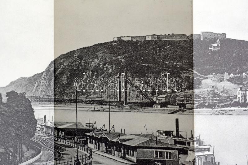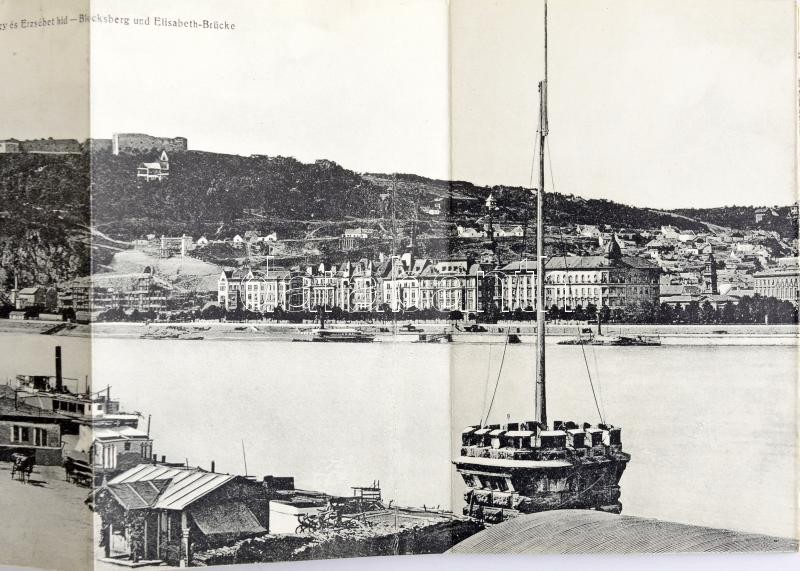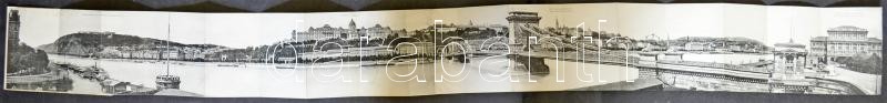 Budapest, Gellért-hegy, Erzsébet híd, Királyi vár, Lánchíd, Mátyás templom, Halászbástya, Magyar Királyi Tudományos Akadémia. Kihajtható óriás panoráma / Giant folding panoramacard (szakadás a tokon / tear in the case)