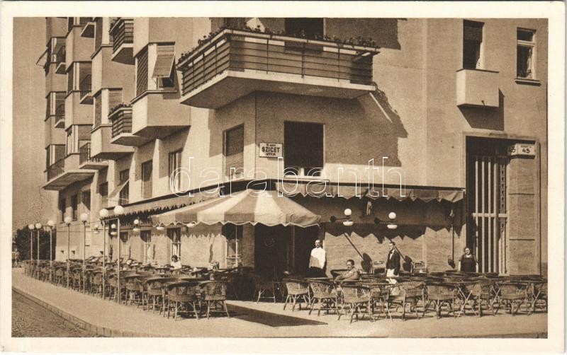 Leírás: Budapest XIII. Brioni kávéház terasza, Sziget utca (ma Radnóti Miklós utca) és újpesti rakpart sarok