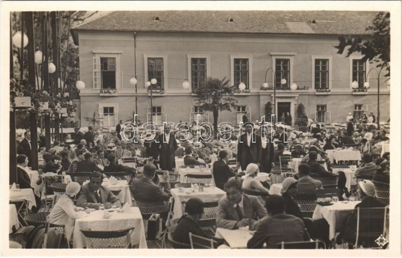 Leírás: Budapest XIII. Margitsziget, Flóris cukrászda kerthelyisége pincérekkel és vendégekkel