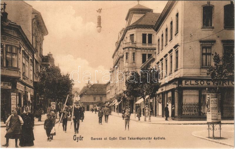 Leírás: Győr, Baross út, Győri Első Takarékpénztár épülete, Grünwald Mihály gyógyszertára, Brandstein és Schöpf István üzlete