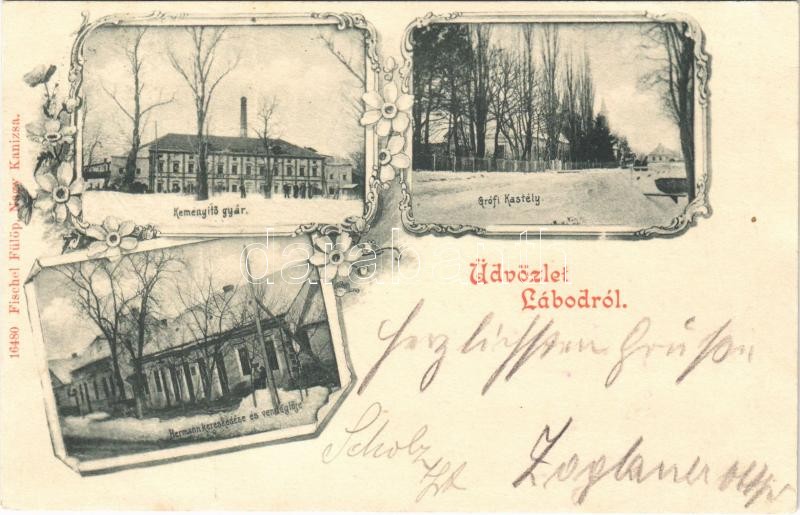 Leírás: Lábod, keményítő gyár, grófi kastély, Hermann kereskedése és vendéglője, tél. Fischel Fülöp kiadása, Art Nouveau, floral
