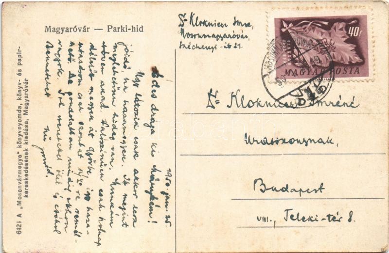 Magyaróvár, Mosonmagyaróvár; Parki híd, lovaskocsi https://www.darabanth.com/hu/35-Nagyaukcio/35.1/Kepeslapok/Magyarorszag~14666/Magyarovar-Mosonmagyarovar-Parki-hid-lovaskocsi~II2361354