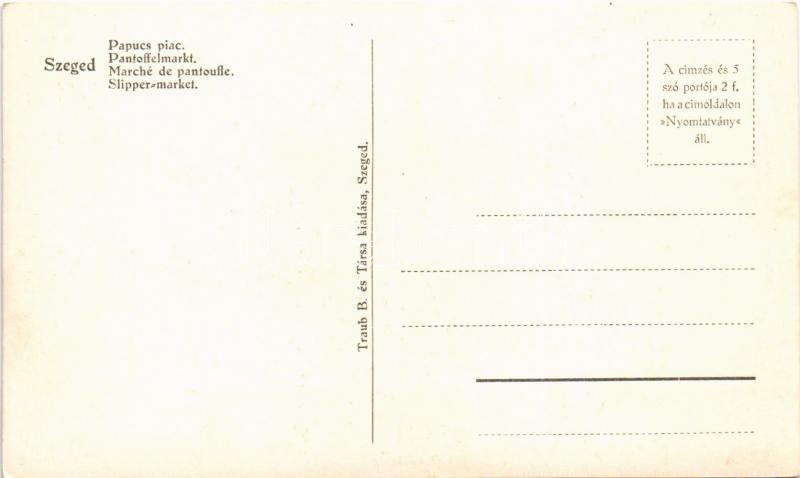 Szeged, Papucs piac, árusok. Traub B. és társa kiadása https://www.darabanth.com/hu/35-Nagyaukcio/35.1/Kepeslapok/Magyarorszag~14666/Szeged-Papucs-piac-arusok-Traub-B-es-tarsa-kiadasa~II2362999
