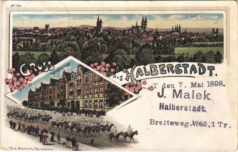 Leírás: 1898 (Vorläufer) Halberstadt, Spiegelstrasse, Die Bismark Kürassiere / street, military parade, Cuirassiers (fl)