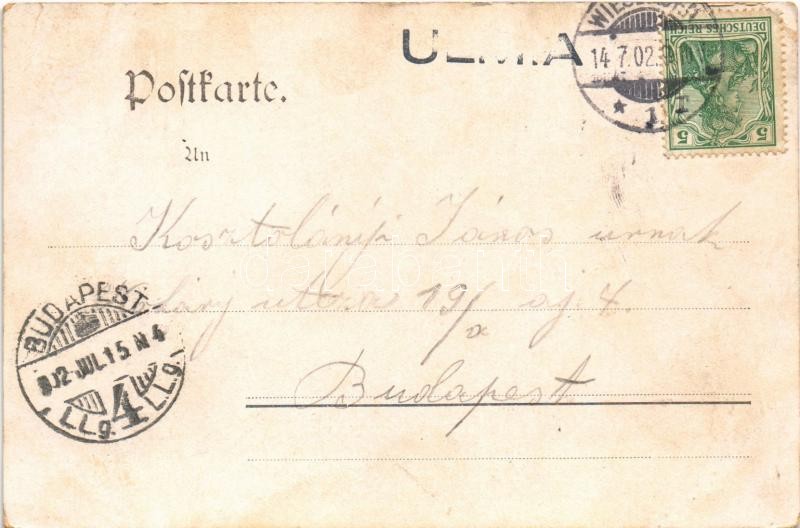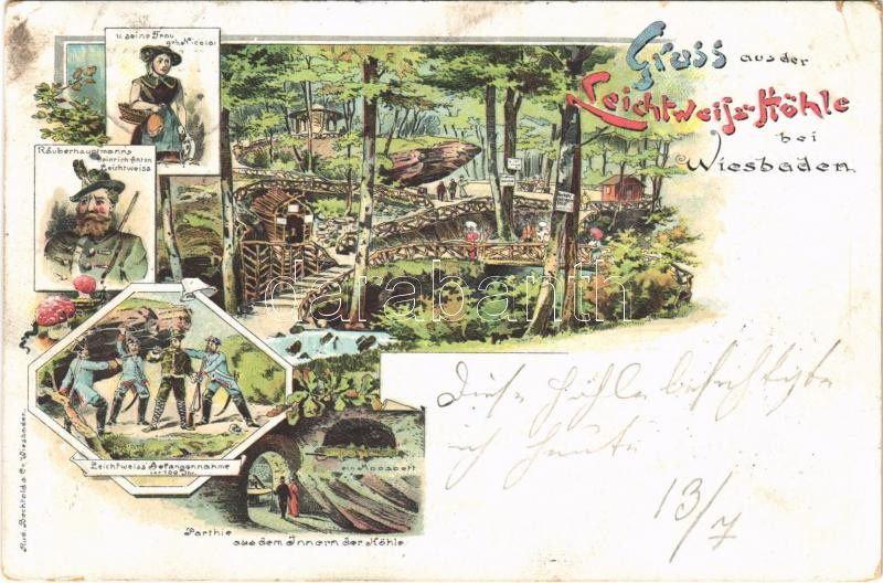 1902 Wiesbaden, Gruss aus der Leichtweiss-Höhle, Seine Frau geb. Nicolai, Räuberhauptmann Heinrich Anton Leichtweiss, Gefangennahme, ein Moosbett, Parthie aus dem Innern der Höhle / robber capatain and his capture, cave, moss bed. Rud. Bechtold Art Nouveau, floral, litho (EK)
