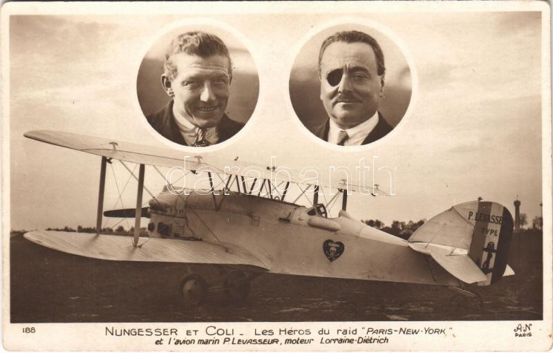 Nungesser et Coli - Les Héros du raid "Paris-New York", et l'avion marin P. Levasseur, moteur Lorraine Dietrich / L'Oiseau Blanc - francia Levasseur PL.8 kétfedelű repülőgép, mely 1927-ben Párizs-New York óceánátrepülés közben eltűnt / French Levasseur PL.8 double-deck aircraft that disappeared in 1927 during a Paris-New York transatlantic flight