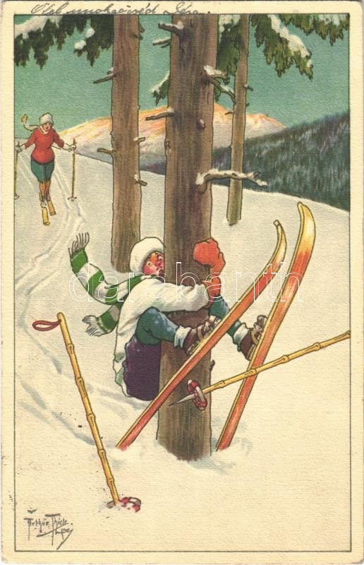 Leírás: 1929 Síbaleset, humor. Téli sport művészlap / Ski accident, humour. Winter sport art postcard. A. Ruegg 548. s: Arthur Thiele