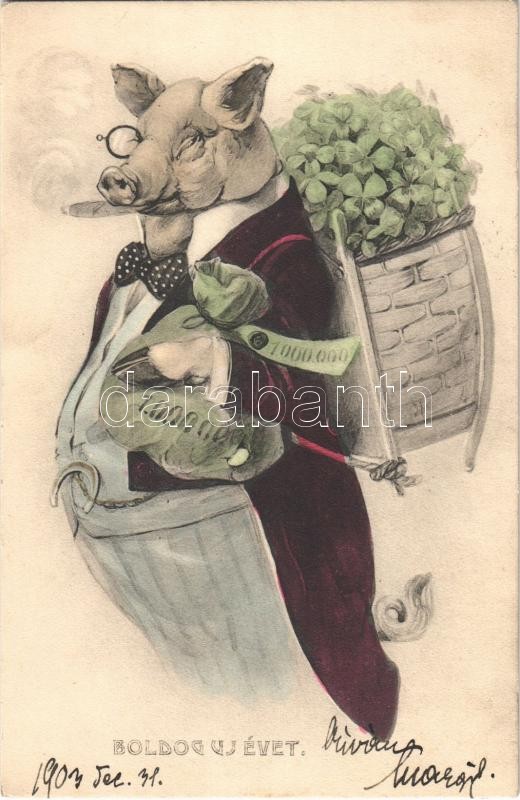 Leírás: 1903 Boldog új évet! Szivarozó malac úr egy hátitáskányi lóherével / New Year, pig gentleman with a bag of clover