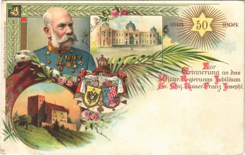 1848-1898 Zur Erinnerung an das 50 jähr. Regierungs Jubiläum Sr. Maj. Kaiser Franz Josef I. / Ferenc József uralkodásának 50. évfordulója / Franz Joseph's 50th anniversary of reign. Art Nouveau, floral, litho