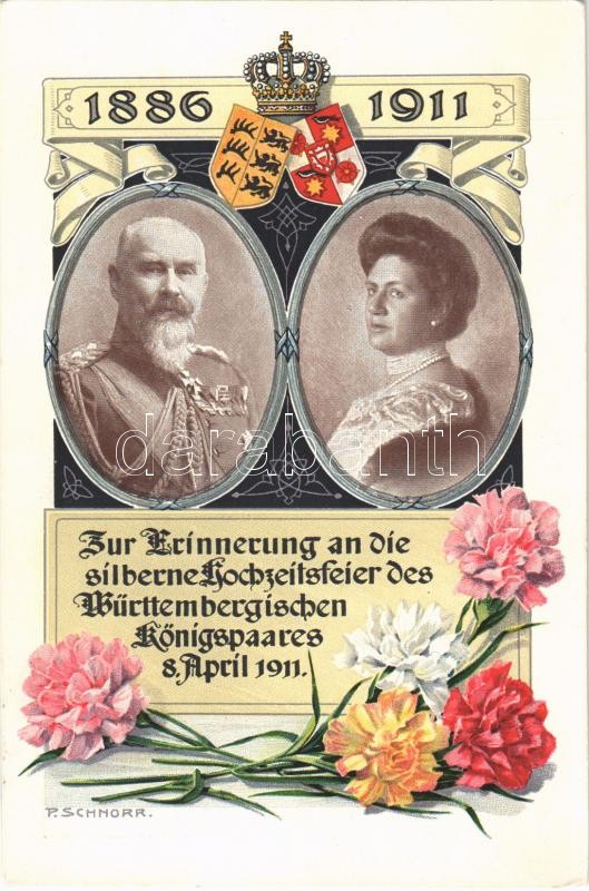 1886-1911 Zur Erinnerung an die silbernehochzeitsfeier des Württembergischen Königspaares 8. April / Silver wedding anniversary of Wilhelm II. (Württemberg) and his wife Charlotte zu Schaumburg-Lippe. Eckstein & Stähle Art Nouveau, floral, litho s: P. Schnorr