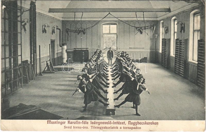 1916 Nagybecskerek, Zrenjanin, Veliki Beckerek; Messinger Karolin féle leánynevelő intézet, belső, svéd torna óra, törzsgyakorlatok a tornapadon / girl school interior, gym class (ázott / wet damage)