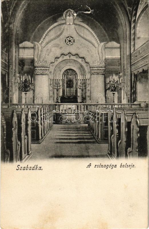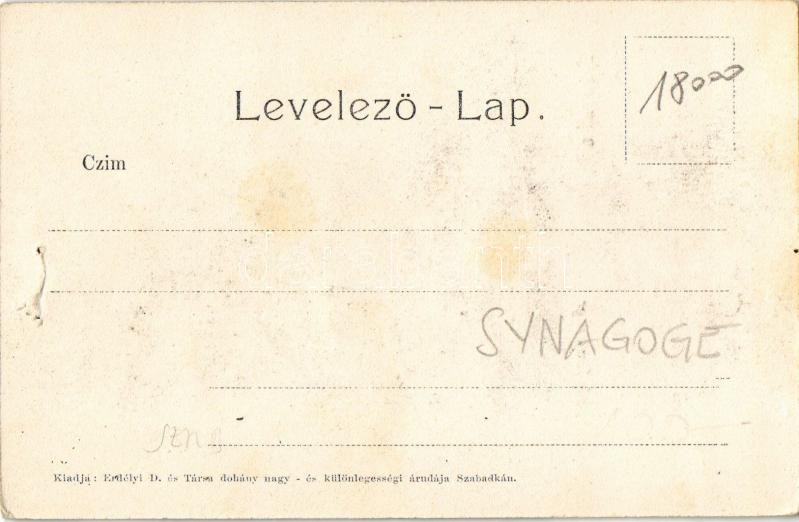 Leírás: Szabadka, Subotica; a zsinagóga belseje. Kiadja Erdélyi D. és Társa / synagogue interior (apró lyukak / pinholes)