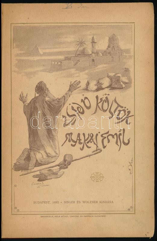 Makai Emil: Zsidó költők. Műfordítások Salamon Ibn Gabiról, Juda Halévi, Sámuel Hánágid, Mózes Ibn Ezra, Ábráhám Ibn Ezra, Chárizi, Manuello verseiből. XI-XIV. század. László Fülöp rajzaival. Bp., 1892, Singer és Wolfner, VIII+2+255+3 p. Első kiadás. Átkötött félvászon-kötés, kopott borítóval és gerinccel, javított, kissé sérült kötéssel, az elülső papírborítót bekötötték, a címlapon hiánnyal. A fordító, Makai Emil (1870-1901) költő, műfordító által dedikált. A személynek a nevét, akinek szól a dedikáció kivágták. "... őszinte tisztelettel és ragaszkodása jeléül. B(uda)pest, 1892. 10/II. Makai Emil." Ritka!