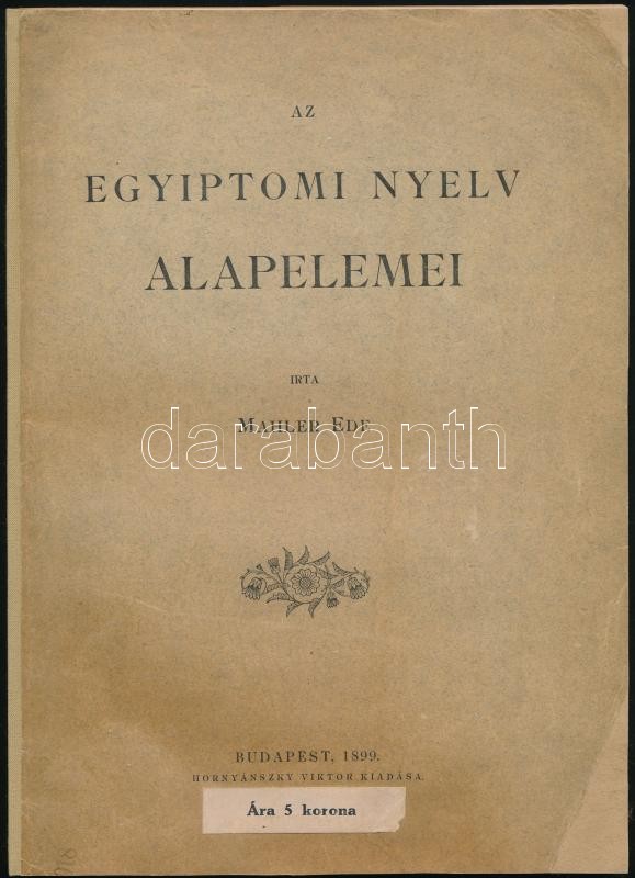 Mahler Ede: Az egyiptomi nyelv alapelemei. Bp., 1899, Hornyánszky Viktor, XXI+2+90 p. Félvászon-kötés, a gerinc, az elülső borító sarkain, és az elülső 3 lap sarkán restauráció nyomával.
