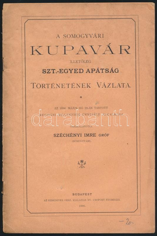 A somogyvári Kupavár, illetőleg Szt.-Egyed apátság történetének vázlata. Az 1896. május hó 28-án tartott kupavári millennium ünnepély alkalmára. Összeáll.: Széchényi Imre gróf (Somogyvári.) Bp., 1896, Szerzői kiadás, (Ezredéves Országos Kiállítás XV. Csoport-ny.), 20 p. Kiadói papírkötésben, szakadt borítóval. Ritka!