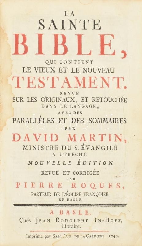 La Sainte Bible, qui contient le vieux et le nouveau Testament, revue sur les originaux, Par David Martin, Ministre du Saint Evangile a Utrecht.