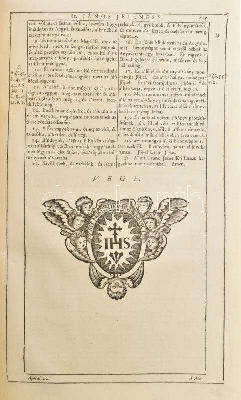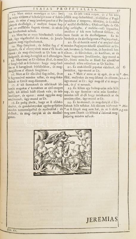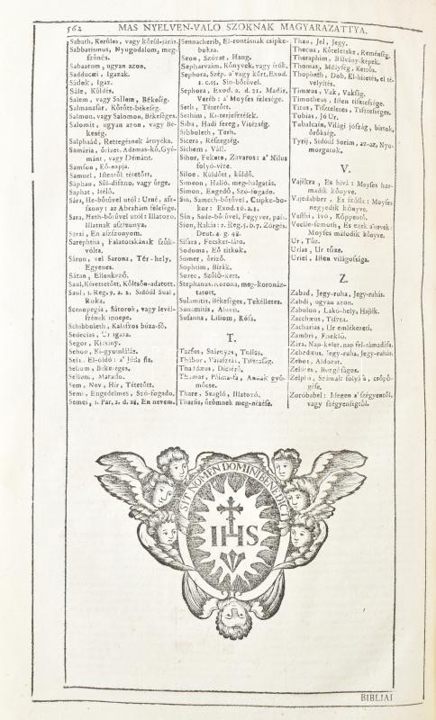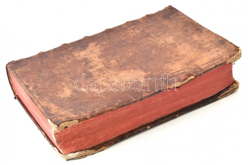Szent Biblia, mellyet az egész keresztyénségben be-vött régi deák bötűből magyarra fordította a Jésus-alatt vitézkedő társaság-béli nagy-szombati Káldi György pap. Nagyszombat, 1732., Academiai bötűkkel Berger Leopold, 1t. (rézmetszetű díszcímlap)+1 sztl. lev.+636+562 p.+15 sztl. lev. Fametszetű záródíszekkel. Második kiadás. Korabeli aranyozott, bordázott gerincű egészbőr-kötésben, festett lapélekkel, kopott, sérült borítóval és kopott, sérült gerinccel, egy lap sérült (I. r. 7/8 p., néhány lapon aláhúzás (I. r. 568., 569., II. r. 2, 252) és bejelölések (II. r. 8.,9.) két lap restaurált (487/488, 495/496), pár lapon kis lapszéli foltokkal (II. r. 289-332.), a második részben kissé foltos lapokkal (469-520), majd az azt követően foltos lapokkal (520-562 p.+15 sztl. lev.), valamint néhány kissé foxing foltos lappal, egy lapon kis lapszéli sérülésekkel(353/354.)