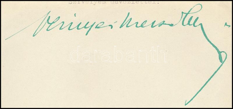 1943 Szinyei-Mersei Jenő (1888-1957) a Kállay-kormány vallás és közoktatásügyi miniszerének (1942-1944) saját kezű aláírása egy köszönő levélen, fejléces papíron.