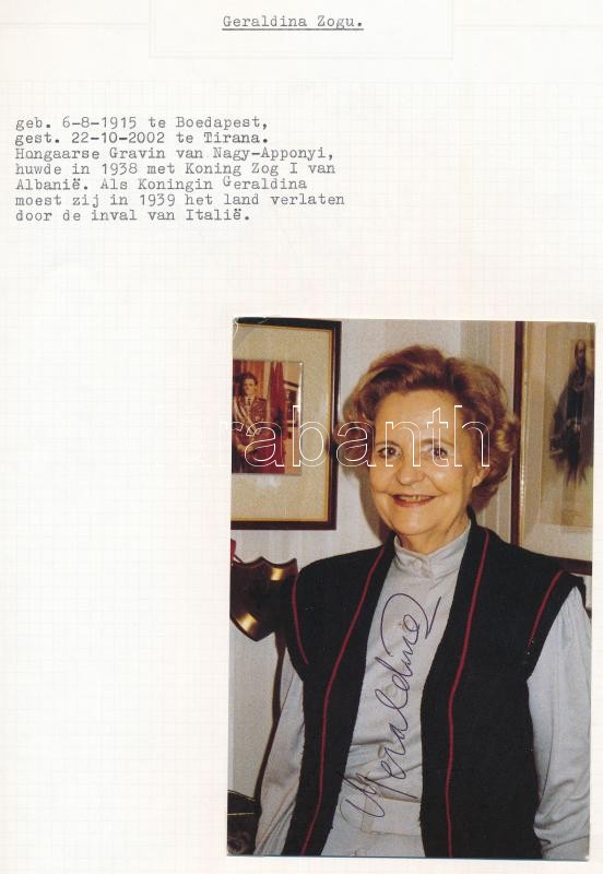 Geraldine (albánul Geraldina vagy Xheraldina, uralkodói címével Mbretëresha Geraldinë/Xheraldinë), szül. gróf nagyapponyi Apponyi Géraldine (1915- 2002) albán királyné autográf aláírása őt magát ábrázoló fotón, lapra rögzítve (nem ragasztva), feliratozva holland nyelven. / Countess Géraldine Apponyi (1915-2002), the Queen consort of King Zog I of the Albanians, autograph signature on her photo, mounted (not glued) on a piece of paper, with description in Dutch languague.